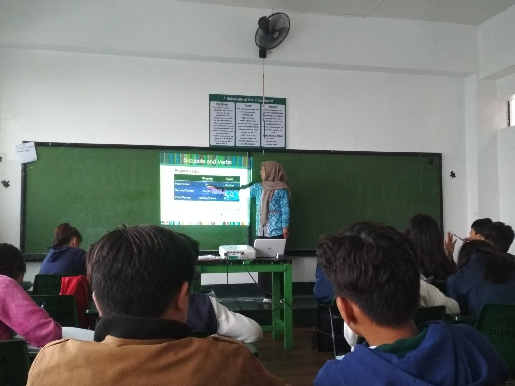 This day is my last day to teach in here. It will be happy, but also a little bit sad. Its mean that I will leave this city soon. At 10 am, I went to school for teach my students. The material is about “subject-verb agreement”. This material is very hard to teach, and my critic teacher also said that. Then, I did my demo at 11 am with Ma’am Amara as my critic teacher who sits behind. and took me a pictures.