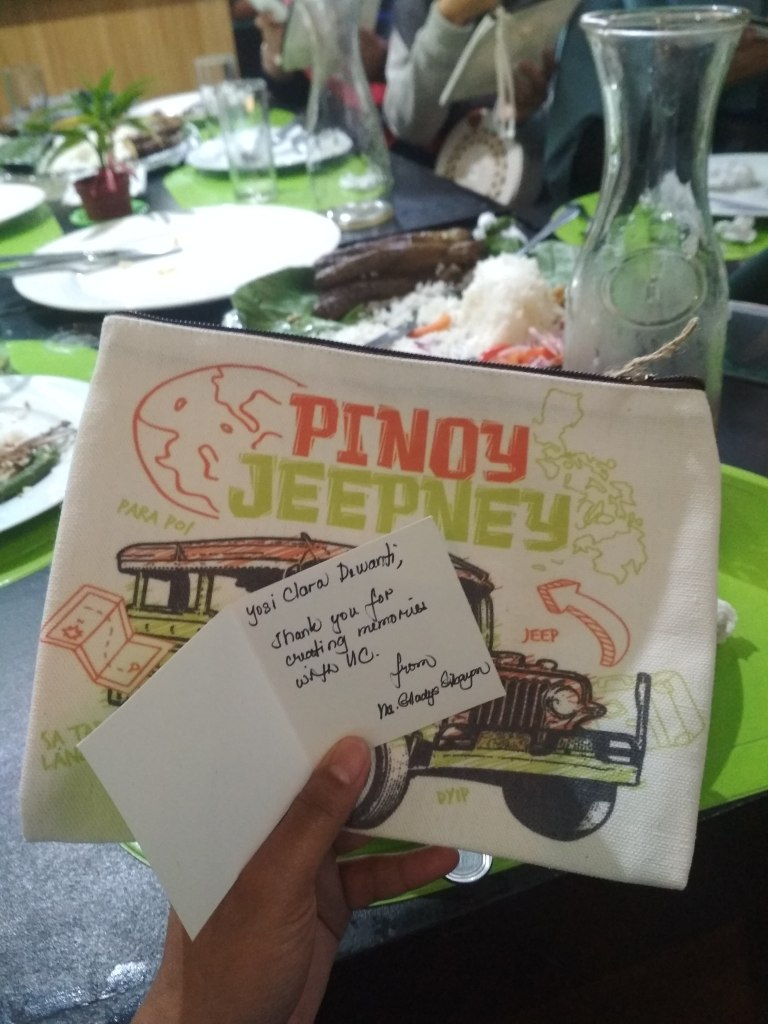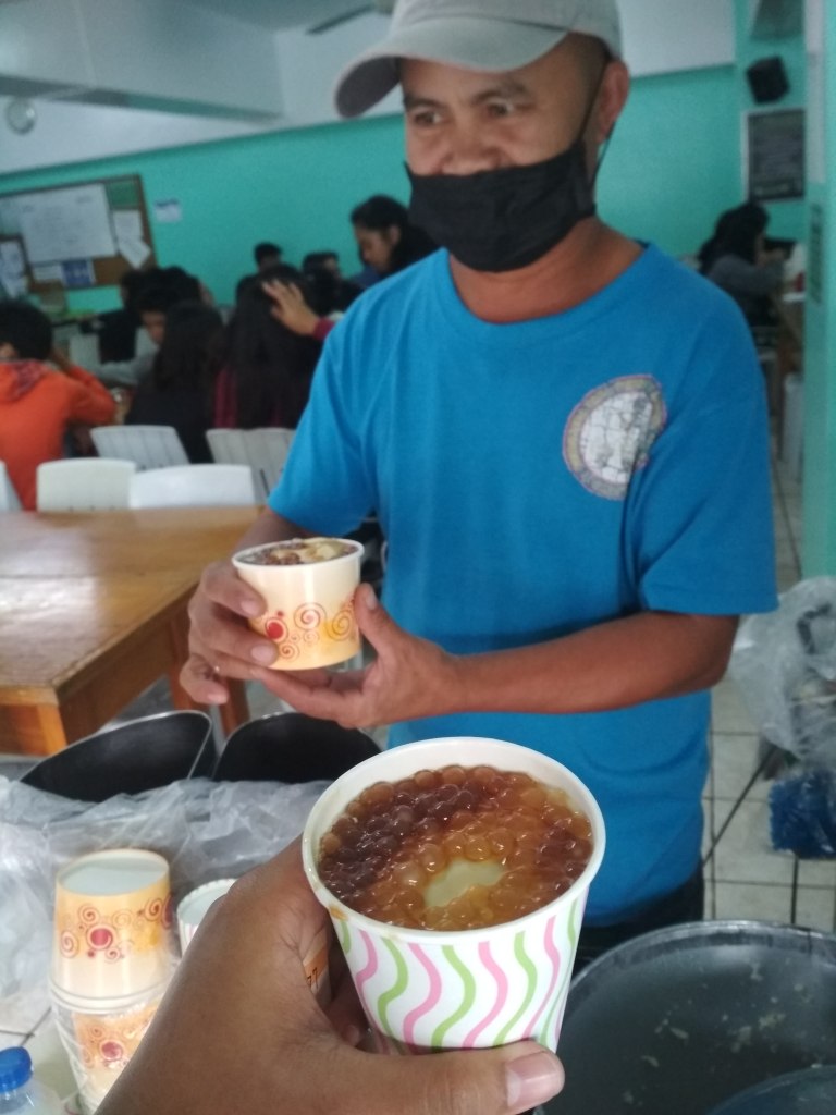 Then, I bought Taho (traditional food from Philippines) and directly go back to UC main campus and prepared for my demo teaching tomorrow. For your information, Taho is made from soy bean with pearl pulp and mix with brown sugar. The taste is very good, but its too sweet. At 5 pm, we have to met with Ma’am Gladys at the Delight and Savor Resto. We ate traditional foods from Philippines, and also Cheese Pizza. After finished, Ma’am Gladys gave us a bag. I really want to cry, because she is very kind to us. Thank you Principal!