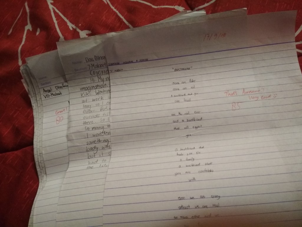 Then, at 10.30 all of us decided to go back early because we have to go to school for teach. So, I hurry up to go to school by Taxi and just alone because Nia didn’t join. After arrived at school, I directly went to teacher’s room and met Ma’am Amara. I just gave my lesson plan to her, then lend the projector from the library. At 11 am, I taught 7-Mabait and the material is about “common purposes of writing”. This day I am not felt nervous anymore, but my students a little bit confused about the material that I taught. So, I explain to them until they are understand. After they understood, I gave them some tasks and let them did it directly. After class, I met with Ma’am Amara and she gave me some advice about my teaching.