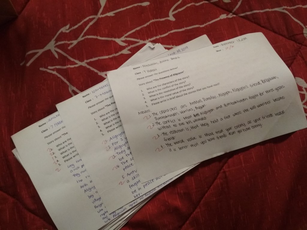 My third day for teach is very nice, because I have known my students and they also feel enjoyed with me. This day, I should teach them the Filipino story about The Prowess of Aliguyon. I let them to read the story first and after that I will give them some question related to the story. So, they did what I said. After finished, I gave them tasks and let them answer it directly. I really like my students, because today they are not noisy and they really participate on my class. After finished, I told them to pass their paper to the front. Then, like usual Ma’am Amara met me for gave me advice. After that, I go back to UC main campus for prepared the material.